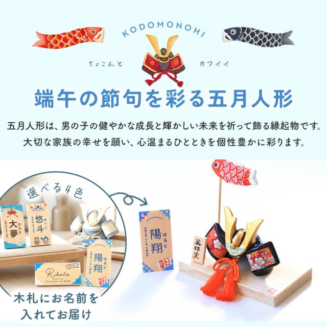 端午の節句を彩る、ちりめん風の可愛らしい五月人形。 兜やこいのぼりまで細部にこだわった、心温まるデザインです。 コンパクトサイズで飾る場所を選ばず、収納もラクラク。 インテリアになじむ優しい雰囲気で、毎年気軽に飾っていただけます。 お名前入りの木札付きで、世界にひとつだけの特別な贈り物に。 お子さまの健やかな成長を願う、初節句のお祝いにもおすすめです。 さらに、お名前入りの木札付きで特別感もプラス。 初節句のお祝いギフトにもぴったりな、心温まる五月人形です。 \ お名前入り木札 / お子さまのお名前と生年月日を入れた、世界にひとつだけの木札。 天然木のやさしい風合いで、五月人形と並べても違和感なく飾れます。 木札は選べる4種類のデザインをご用意。 漢字ひらがなカタカナ対応のデザインや、アルファベット対応デザインがあり、漢字のお名前にはふりがなもお付けいたします。 組み立て不要で、届いたその日からすぐに飾れるのも嬉しいポイント。 コンパクトながら記念に残り、初節句のお祝いにぴったりです♪ 毎年飾るたびに家族の思い出が増えていく、そんなこどもの日をお楽しみください。 |