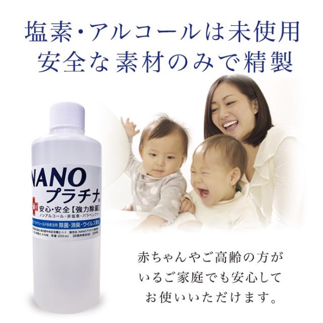 長時間除菌を可能にしたプラチナシールド固定化技術により、塩素やアルコールを使用せず、刺激性が無く優しいNANOプラチナの驚異的な除菌力で長時間の除菌・消臭効果を可能にしました。