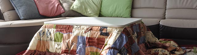 こたつ本体と布団の相性がよいと、暖かさもぐんとアップします。天板より一回り大きい布団を選ぶと、すきま風をふせいで保温性が上がります。布団の厚みや素材もポイント。フランネルやマイクロファイバーなど、手ざわりの良い素材を選ぶと快適です。最近は抗菌や撥水、アルミシート入りの布団も増えているので、ライフスタイルにあわせて選んでみましょう。