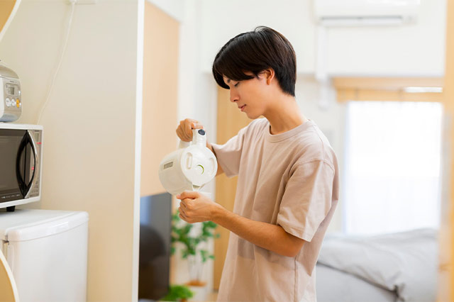 価格も手ごろで、短時間で1人分のお湯を沸かしてくれるのが電気ケトル。カップラーメンやカップスープを作るときに役立つだけでなく、フリーズドライのお味噌汁や紅茶・コーヒーなどを淹れたりもできます。サイズもコンパクトで、キッチンの上だけでなく、テーブルや机の上にでも置けるため、設置場所に悩むこともないでしょう。