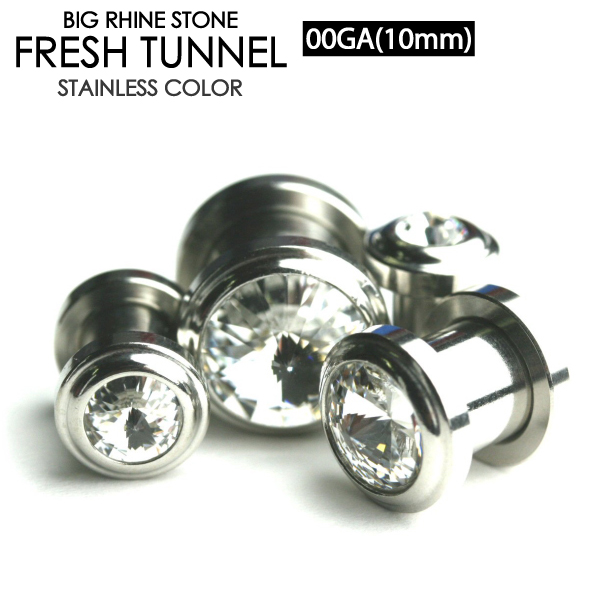 メール便 送料無料 フレッシュトンネル BIGラインストーン 00GA(10mm) サージカルステンレス316L【ボディピアス ジュエル付 ロブ アイレット イヤーレット】00ゲージ ┃
