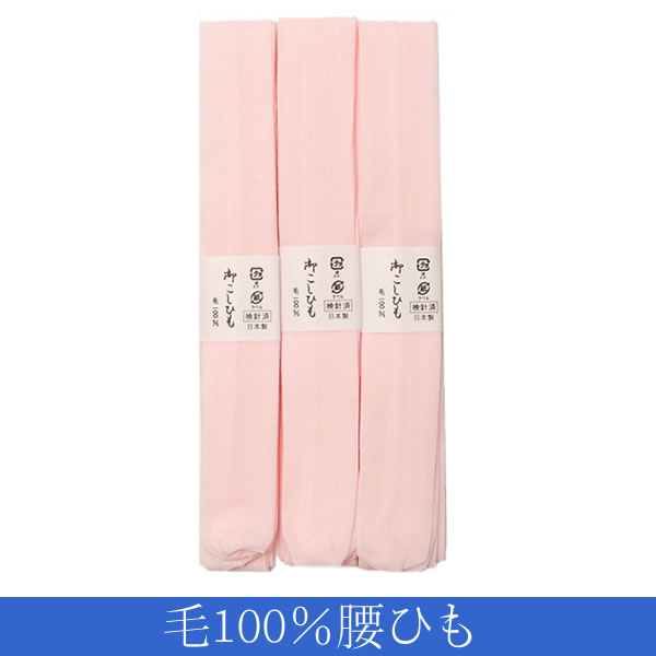 帯の形を整え着崩れを防いだり、おはしょりを作るのに使用するお着物の着付け用広巾腰紐3本セットです。素材はモスリン(ウール)で洗いにも強く、滑りにくく締めやすいのが特徴です。こしひもの色は白とピンクがございますのでお好きなほうをお選びください。