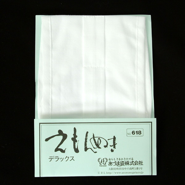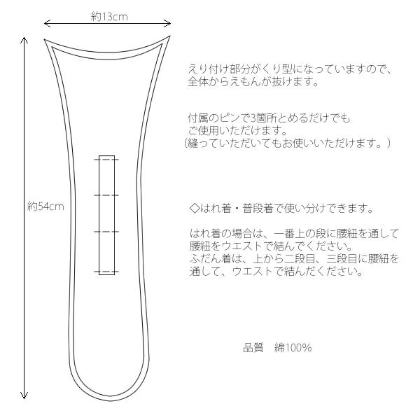 衿の抜き具合は着物姿の印象をがらりとかえてしまうぐらい大事な要素!衿付け部分がくり型に丸くなっていますのでよることなく、全体からきれいに衣紋が抜けます。また、3段階の紐通しで、晴れ着用、普段着用とシーンに合わせてふさわしい抜き具合を調節することができます。すっきりと美しい衿元を決めるデラックスタイプであなたらしい衿の抜き方を習得してくださいね。(付属の安全ピンでも留めていただけますし、縫い付けていただいても結構です)。