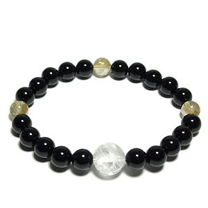 龍を彫った水晶1玉とルチルクォーツ3玉を四方に配置したブレスレットです。漆黒のオニキスは非常に強力な魔除けの力をもつといわれている天然石です。知識を高めたり、精神力や運動能力を強化する力もあるといわれています。