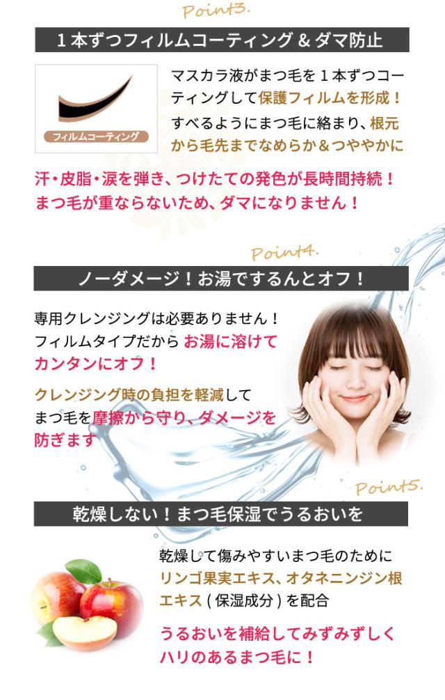 形状や毛の巻き数まで計算しつくされたブラシが、目頭から目尻まで完全フィット! 朝つけたら夜まで滲まずカールくるん! 黒々とした艶と上向きカールが持続。 ダマにもパンダ目にもなりにくく、まぶたにも付きにくいマスカラです。 ウォータープルーフなのに、特殊フィルム製法でお湯でするっとオフ。 専用クレンジングは必要ありません。 まつ毛のトリーメント成分を配合。