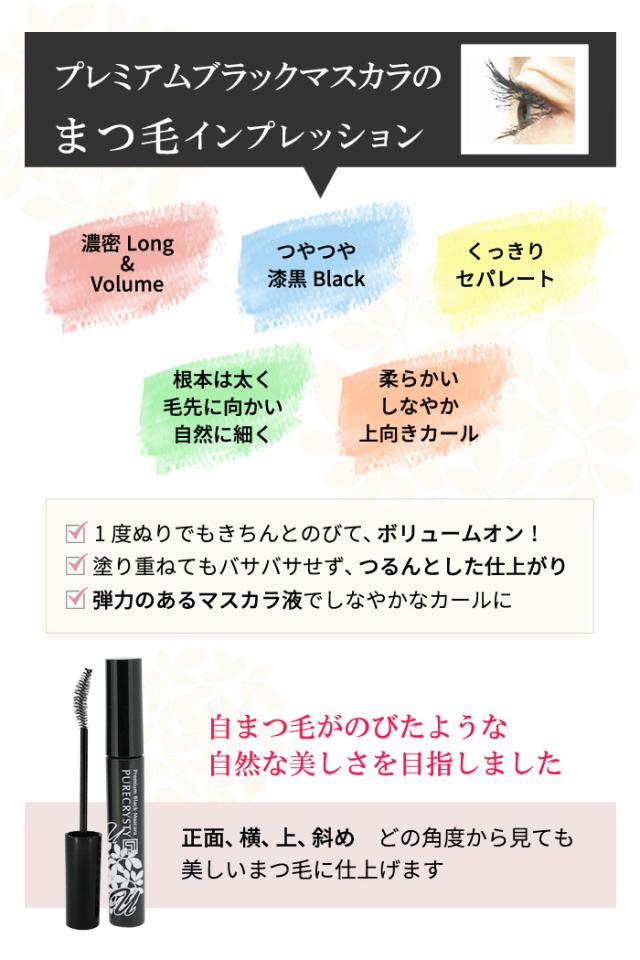 | 商品名 | ピュアクリスティ職匠 プレミアムブラックマスカラ (合成香料フリー・合成酸化防止剤フリー・合成色素フリー・紫外線吸収剤フリー ) |