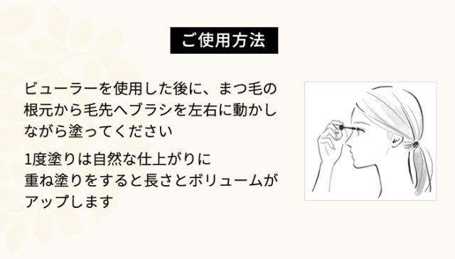 | ご使用方法 | まつ毛の根もとから毛先に向かってブラシを動かし、適量をつけてください。 | ||||||||||