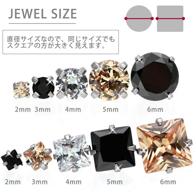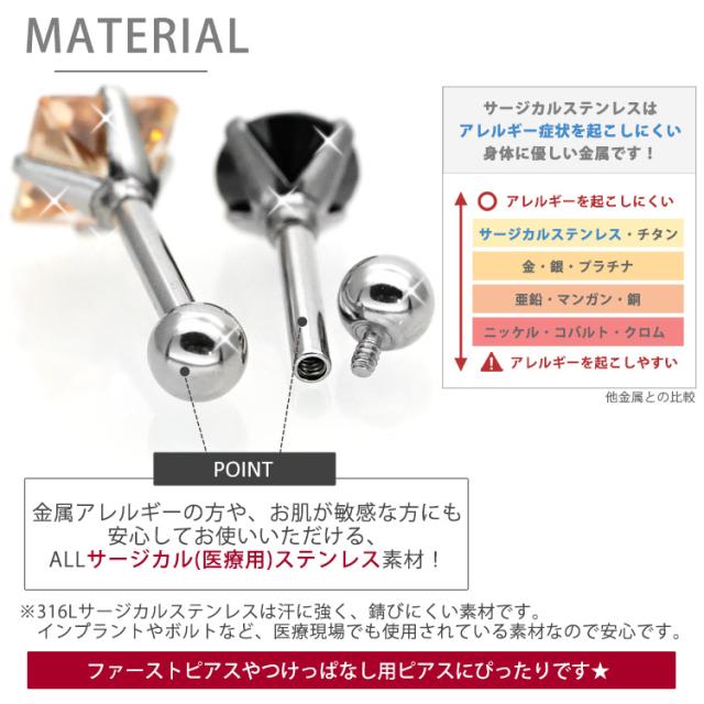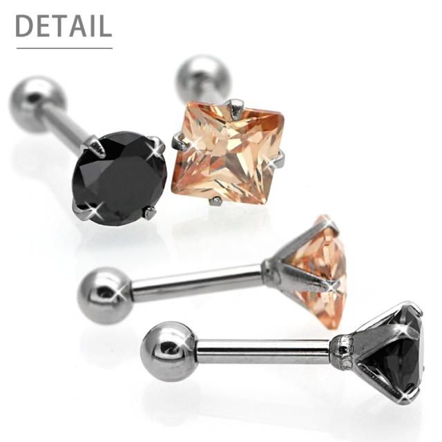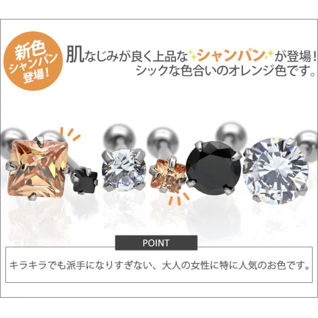 キュービックジルコニアが輝くストレートバーベル。サージカルステンレス製だから、金属アレルギーの方にも安心してご使用いただけます。定番のクリアとブラックに加えシャンパンカラーが登場。ジュエルのカットもラウンド型とスクエア型で、5サイズ揃えましたので絶対お好みのアイテムが見つかるはず! オーソドックスでシンプルなフォルムだから、普段使いにもピッタリなステンレスピアス!定番のこのデザインは1個持っていると様々な場面で活躍してくれますよ♪