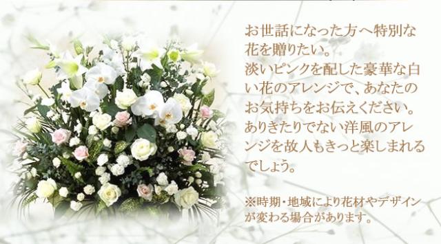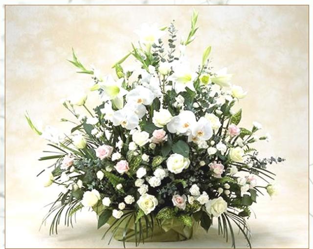 淡いピンクを配した豪華な白い花のアレンジで、あなたのお気持ちをお伝えください。