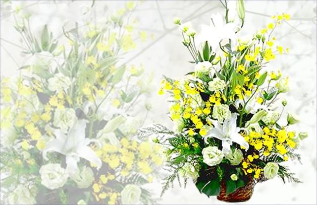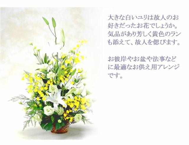 花 お供え 白大輪ユリと黄色のランのアレンジ 送料無料 翌日配送 百合 蘭 御供 お供え お悔やみ 花 生花 アレンジメント 仏花 供花 命日 喪中お見舞い 法事 法要 葬儀 お葬式 お通夜 命日 お盆 お彼岸