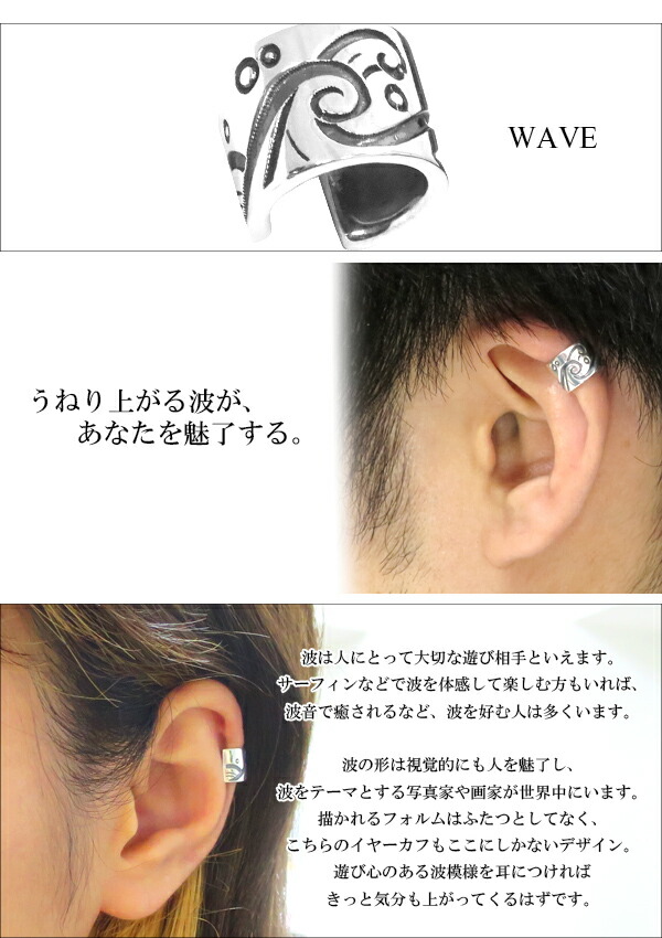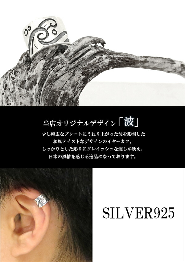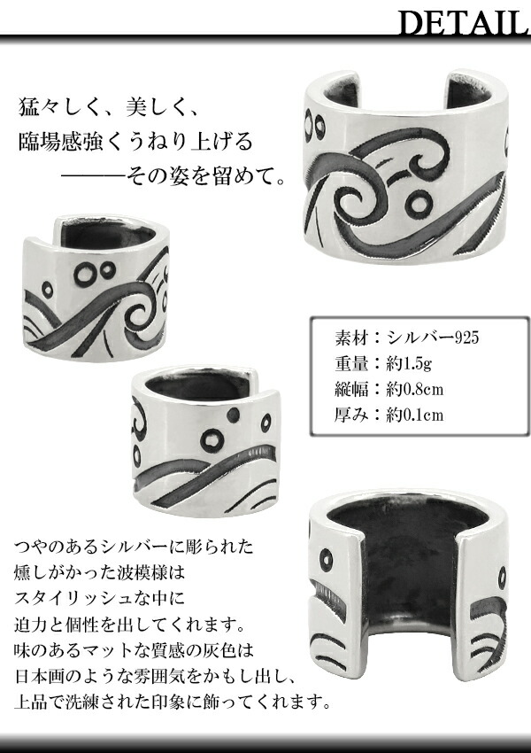 和風テイストな波の模様がデザインされたイヤーカフです。形状はシンプルですが、幅広のシルバーにはっきりと波模様が描かれていて、ハード系のアクセにも負けない存在感を発揮してくれます。