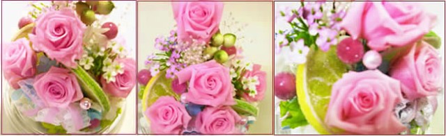 ■材料:プリザーブド中輪ピンクバラ5輪、シルクローズ、実、アジサイ、カスミソウ、わすれな草、パール、ライムシュガー、レモンシュガー