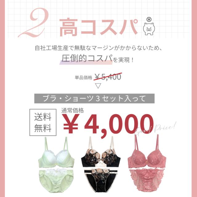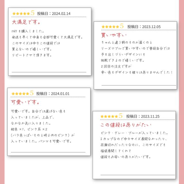 - 白に淡い紫のレース、淡いピンク、紺の3点でした。1つだけちょっと頼りない生地で出来た商品がありましたが、2つがとても着用感がよかったので大満足です。また購入しようと思います。