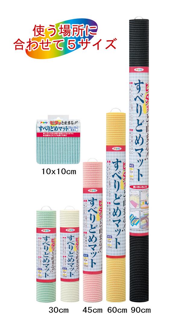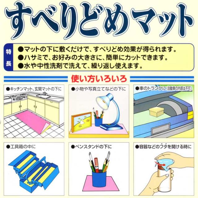 ピタッと止まる!カラフルなすべりどめマット。マットの下に敷くだけで、すべりどめ効果が得られます。ハサミでカットしてお好みの大きさ、形状で使うことも可能です。水や中性洗剤で洗うことも可能なので、繰り返し使えます!