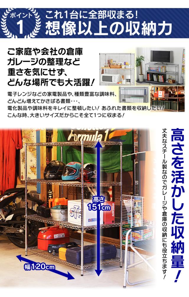 リビング・キッチンなどいろいろな場所で使用できる、インテリア性の高いクロームメッキ仕上げのラックです。大型のAV機器やキッチン家電はもちろん、タイヤを平積みのまま収納することも可能です。クギやネジを使わずに簡単に組立てOK♪棚の高さは自由に変えられます。
