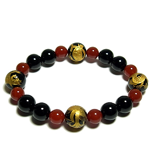 ◆風水・四神獣金手彫りオニキス 12mm玉◆ 赤メノウ・オニキスブレスレット (メンズMサイズ)