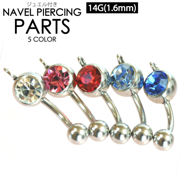 【メール便対応】ヘソピアス ジュエル付 パーツ14G(1.6mm) バナナバーベル サージカルステンレス ハンドメイド用 カスタム 手作り ボディピアス ボディーピアス カラー ラインストーン 5色 14ゲージ ┃