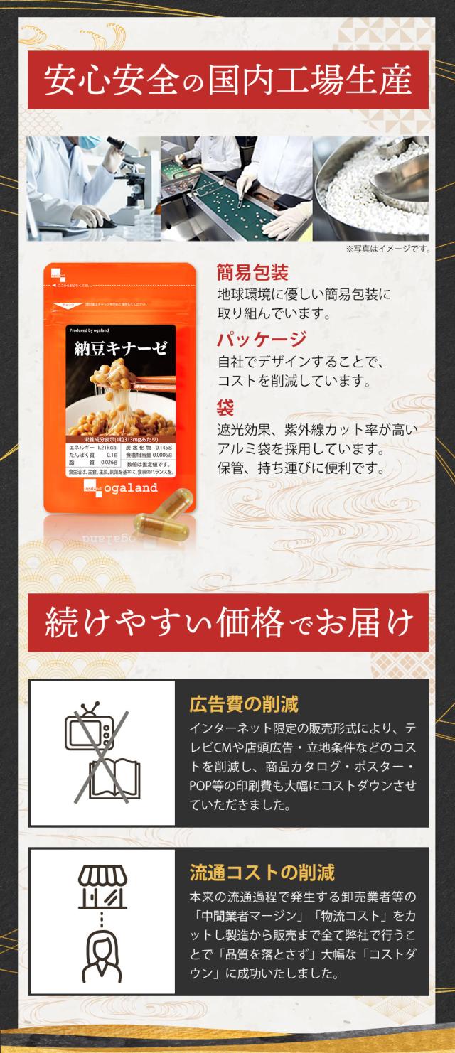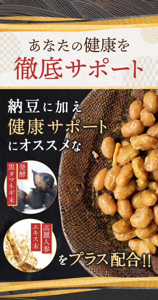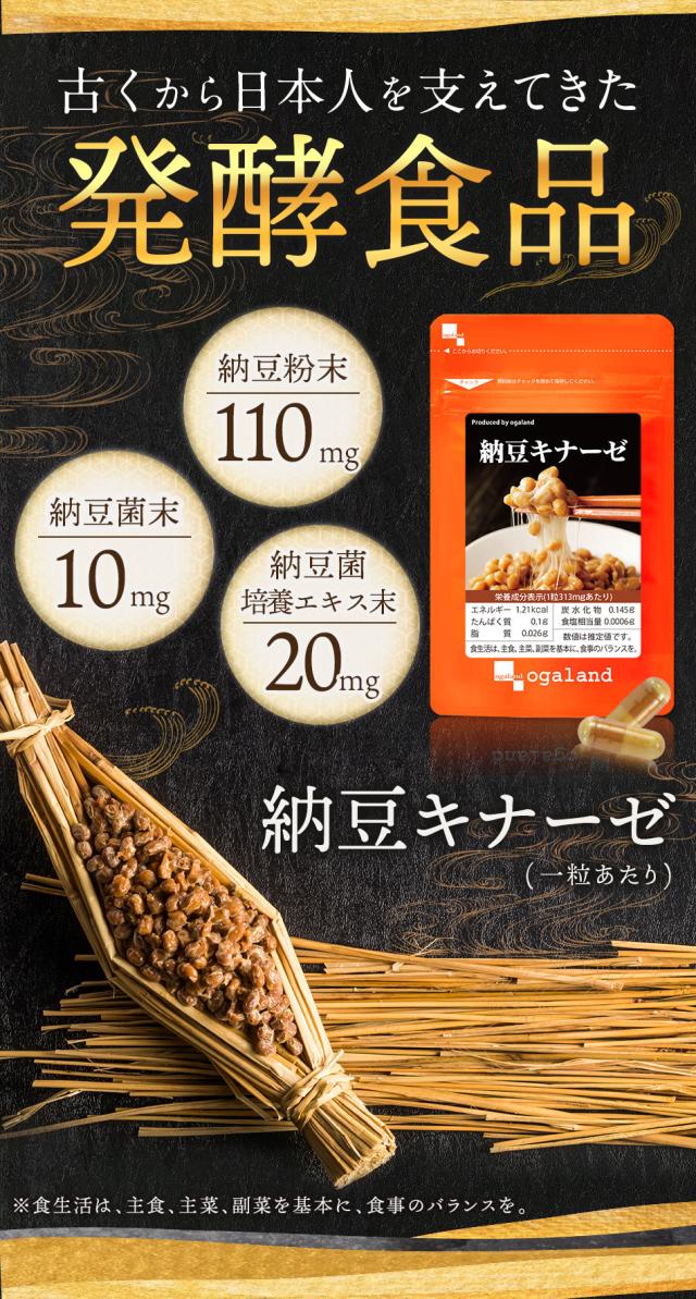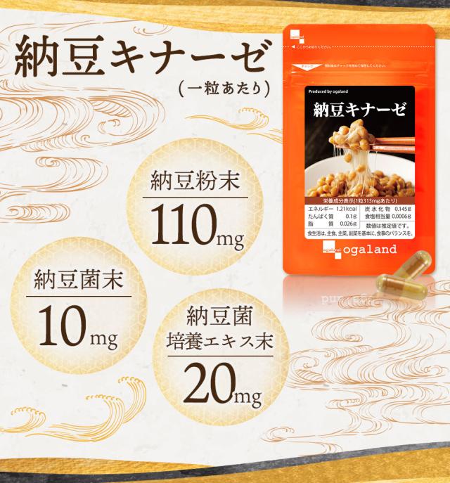 納豆粉末(国内製造)、澱粉、納豆菌培養エキス末(難消化性デキストリン、納豆菌培養エキス、大豆タンパク)、デキストリン、納豆菌末、発酵黒タマネギパウダー、高麗人参エキス末(デキストリン、高麗人参エキス)/ゼラチン、ステアリン酸Ca、微粒二酸化ケイ素、着色料(カラメル)、(一部に大豆・ゼラチンを含む)