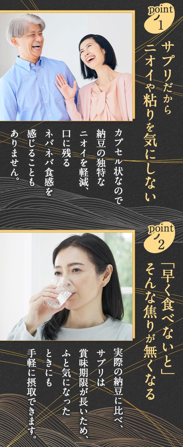 - 納豆が嫌い苦手なのでいつも購入しています、生活習慣病対策の一貫として飲み続けています。また、体の調子が良い気がします!また、無くなり次第購入します。今回もありがとうございました。