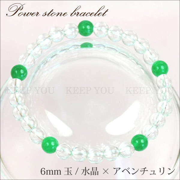 【メール便対応】天然石 ブレスレット 水晶*アベンチュリン5個 数珠 6mm玉【クリスタルクォーツ*インド翡翠 6ミリ数珠】 ┃