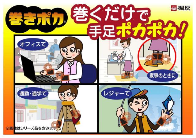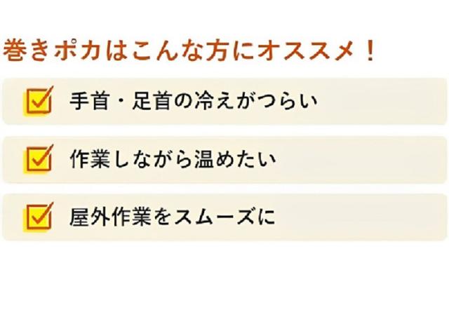 - 仕事で夜間外に居る時間が長くて上半身は防寒着などで寒くは無いんだけど 足は寒くてタイツ2枚&作業着でも耐えられないくらいだったのが【巻きポカ】を使用したら暖かくて 太ももは少し寒いけど 我慢出来る程度 早く買えば良かったと思います ただ6時間しかもたないので★4つ 最低8時間持てば完璧なのに だけど良い 冬の仕事が楽になった