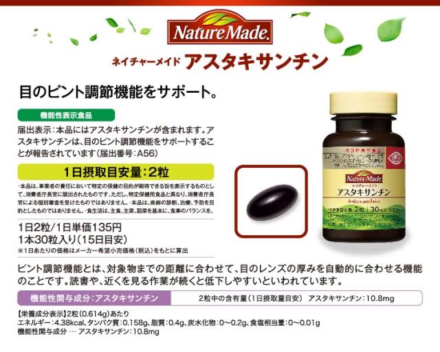 ●届出表示:本品にはアスタキサンチンが含まれます。アスタキサンチンは、目のピント調節機能をサポートすることが報告されています。