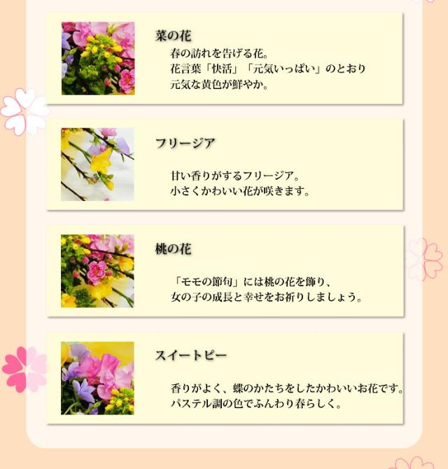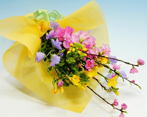 ■花材:桃、菜の花、スイートピー、フリージアなど