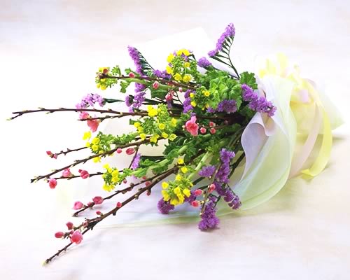 ■花材:桃、菜の花、季節の花(画像はスターチス)など