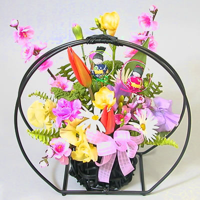 チューリップなど春のお花で飾られた和風のアレンジメント。
