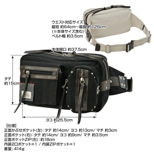 | 商品説明 | 『DEVICE』マディソンシリーズのボディバッグにも使える2wayヒップバッグ&ウエストバッグ!スエードの飾りネームや、部分使用された白化合皮、キャンバス素材を活かしたカジュアル感など、ディテールやデザインにもこだわりました! マグネットホック式のカブセつきポケットや、大きく開く本体上部のファスナーなど荷物の出し入れもスムーズ!内装にはファスナー付きポケットと、大小2つのオープンポケットがあるから小物の整理にももってこいです♪ |