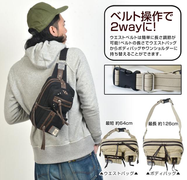 スエードの飾りネームや、部分使用された白化合皮、丈夫なキャンバス素材を活かしたカジュアル感など、ディテールやデザインにこだわった2way ウエストバッグ&ボディバッグ!