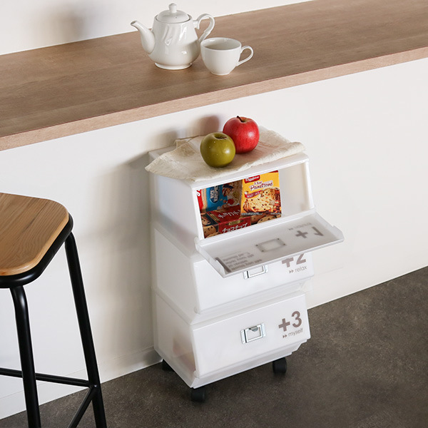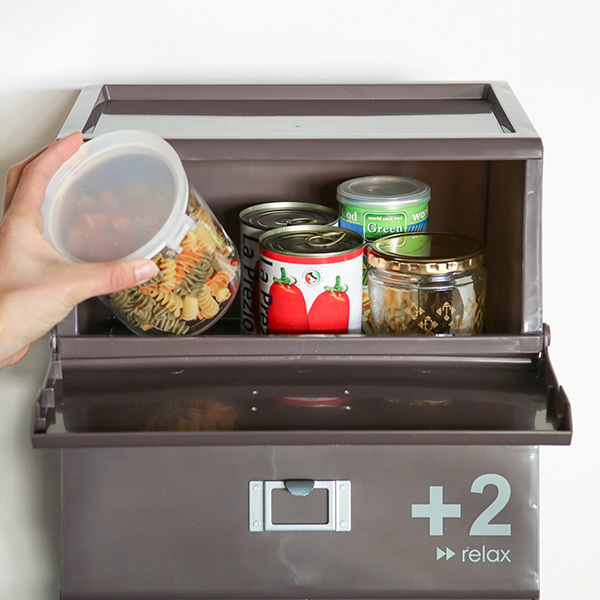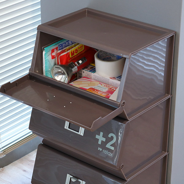 前開きの大きな開口で、見やすく取り出しやすいので使い勝手抜群です。フタは、カパッと開いてそのままキープができるため出し入れする時に便利です。引き出しタイプより開閉にスペースを取らないため、狭い場所にも設置ができます。