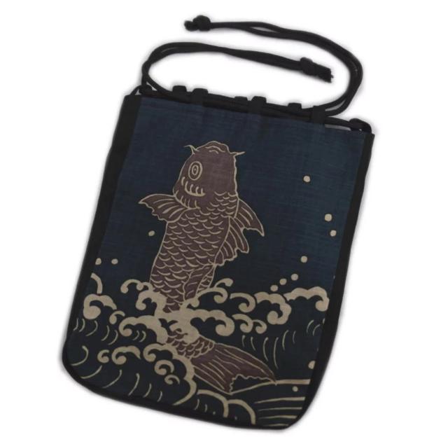 信玄袋 巾着 バッグ メンズ 男性 濃紺色地鯉の滝登り 日本製 浴衣 甚平 着物 男物 紳士用 粋 和柄 開運亭 女性用