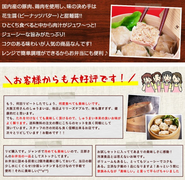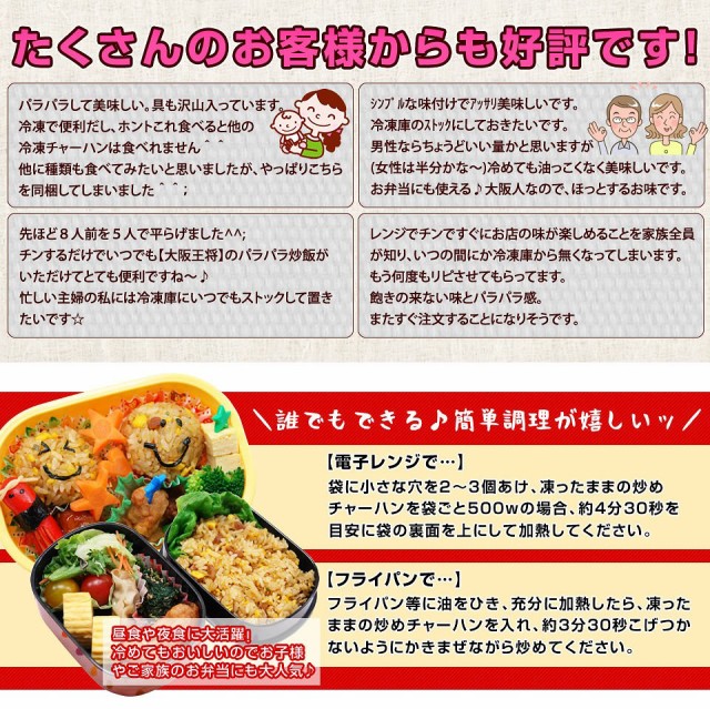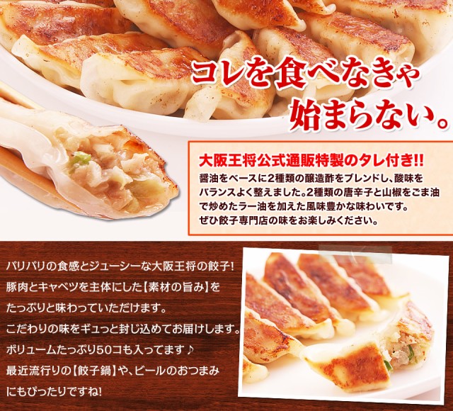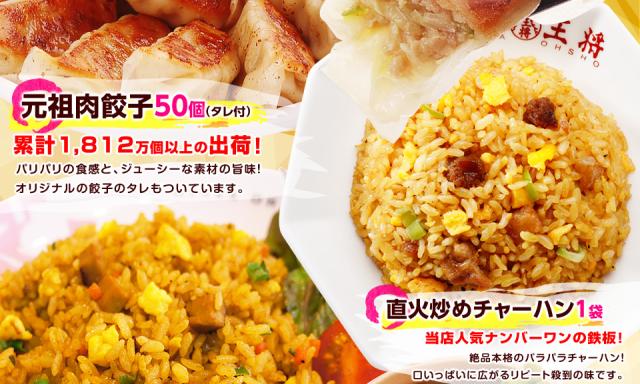【商品内容】肉餃子 1袋50個入(850g)直火炒めチャーハン 1袋(230g)カレーチャーハン 1袋(230g)大粒肉焼売8個入(240g)餃子のタレ6袋【保存方法】冷凍(-18℃以下)保存【賞味期限】約60日以上○購入特典あり♪・2セットご購入の方には、ガーリックチャーハン1袋、豚カルビチャーハン1袋、カレーチャーハン1袋、鶏しそ餃子12個をプレゼント!・3セット以上ご購入の方には、ガーリックチャーハン1袋、豚カルビチャーハン1袋、カレーチャーハン1袋、鶏しそ餃子12個さらに、羽根つき餃子12個、天津飯の具2食がついてくる〜♪