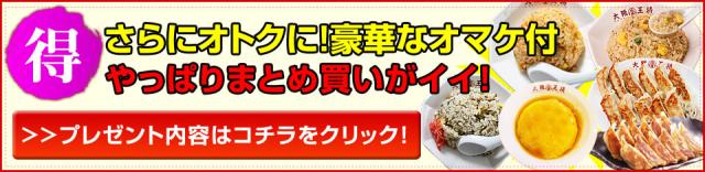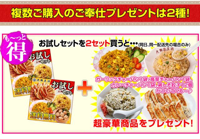 ・2セットご購入の方には、ガーリックチャーハン1袋、豚カルビチャーハン1袋、カレーチャーハン1袋、鶏しそ餃子12個をプレゼント!