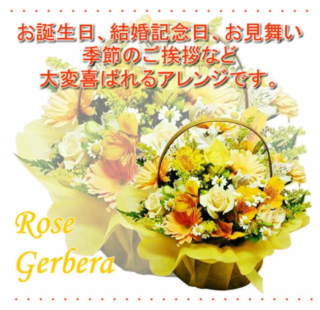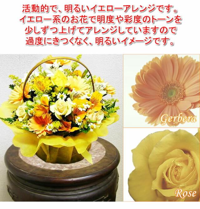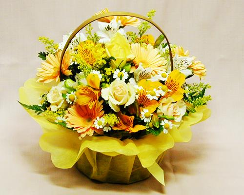 ■花材:黄バラ、イエロー系ガーベラ、アルストロメリア、季節の小花など