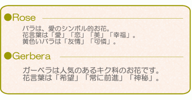 - 梱包もちゃんとしてあり、外箱に運送者に対しての注意書が表示してあり何も心配なく届けていただきました。 自分は花に疎いので、ネットで画像で選べてとても助かりました。 今回は友達のプレゼント用に利用させて貰いましたが、とても喜ばれました。 皆さんも、ちょっとした日や、サプライズに利用されてみてわ?自分は料金以上の喜びがありました。 また利用させて貰います。
