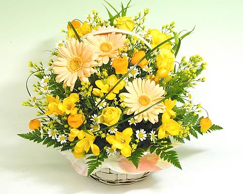 ■花材:黄色スプレーバラ、黄色系ガーベラ、サンダーソニア、フリージア ジングルベグモ、ソリダゴ、またはソリダスター、その他