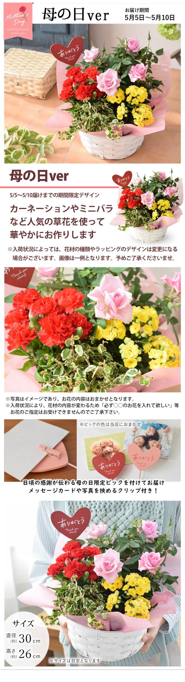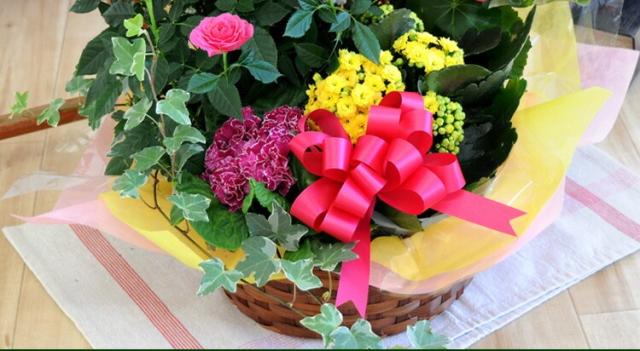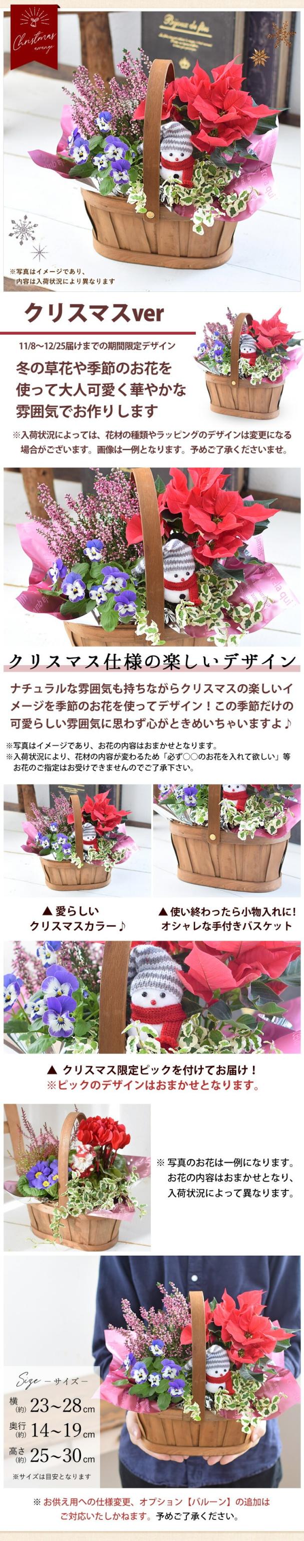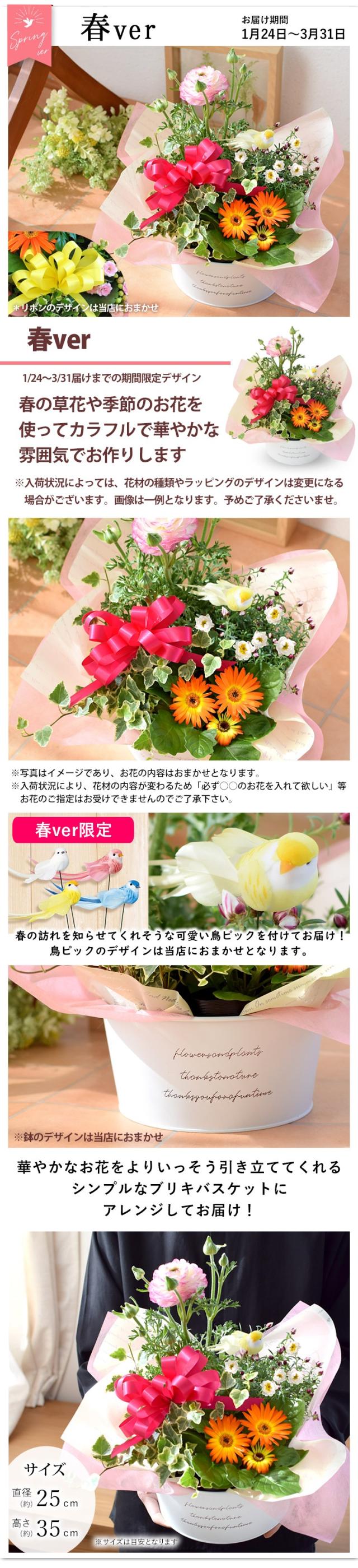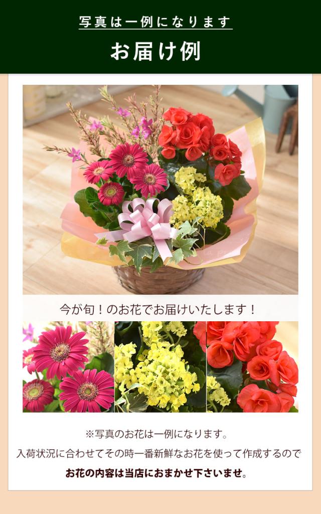 | 内容 | 季節の花、観葉植物/バスケット(デザインおまかせ)/ラッピング/リボン/ 育て方説明書/品質保証付きショップカード ご希望の方にメッセージカード *入荷状況により、資材の種類が異なる場合がございます。 |