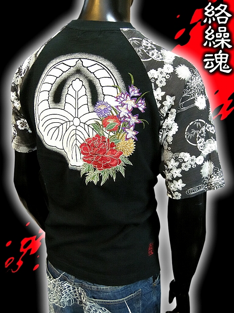 和柄ブランド絡繰魂 黒 桐崩し紋に華刺繍 半袖Tシャツ 292641 カラクリ服チョイワルヤクザヤンキーオラオラ系 悪羅悪羅系 悪党の店 バースジャパン BIRTHJAPAN