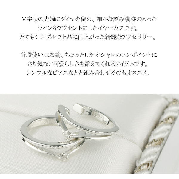 V字状の先端にダイヤを留め、細かな刻み模様の入ったラインをアクセントにしたイヤーカフです。