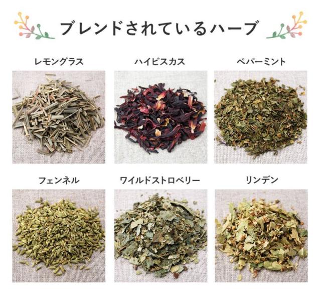 レモングラス(タイ)、ハイビスカス(ナイジェリア)ペパーミント(アメリカ・エジプト )、フェンネル(インド)ワイルドストロベリー(ブルガリア)、リンデン(ルーマニア