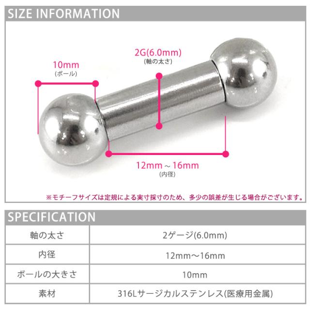 ボディピアスの定番商品、ストレートバーベル。広げて拡張したラージホールを持つ上級者におススメの2Gボディジュエリー。マニアックな2ゲージは約6mm。軸の長さは3種でご用意。舌ピアスや耳の軟骨などで迫力の演出ができます。素材はサージカル(医療用)ステンレス。金属アレルギーが起きにくい素材なので、安心。オートクレーブ滅菌サービスもご利用可能です。