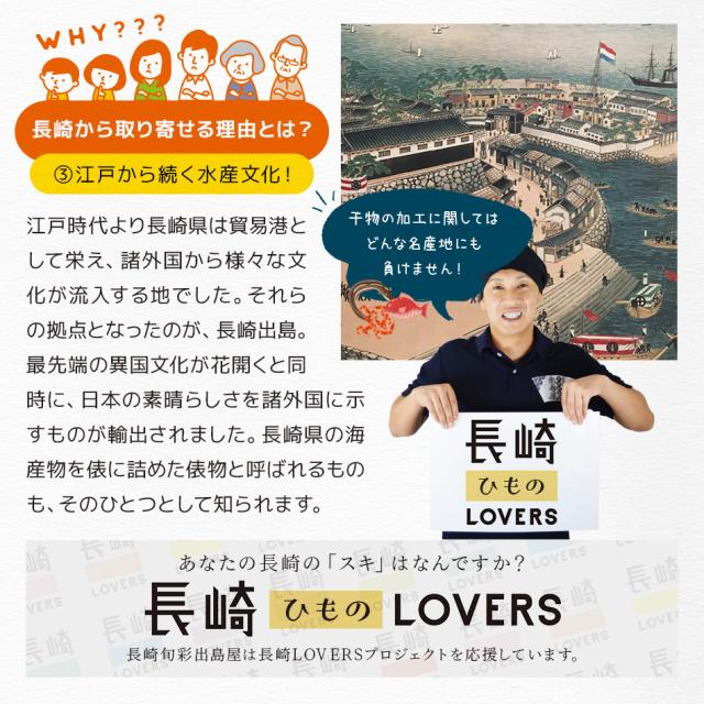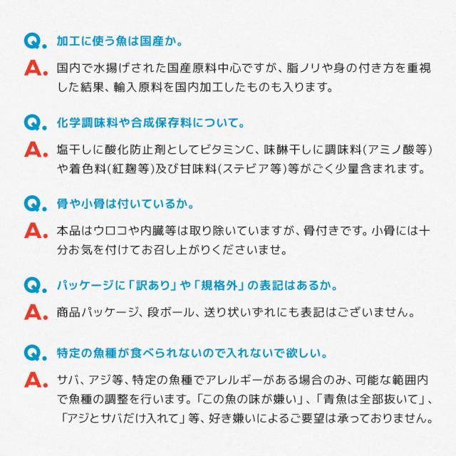 | 原材料 | 魚(国産他/ノルウェー等)[一夜干し]食塩、酸化防止剤(V.C)[みりん干し]食塩、砂糖、醤油、みりん、ごま、調味料(アミノ酸等)、着色料(紅麹、アナトー)、甘味料(ステビア)/加工地:長崎県 |