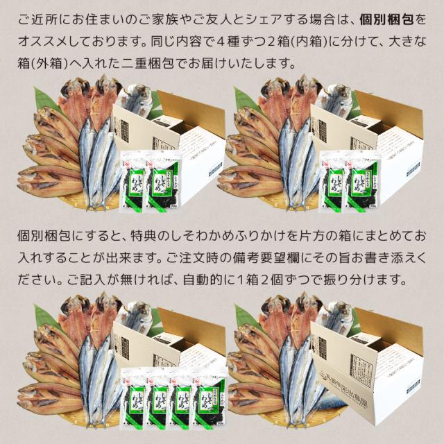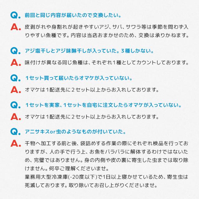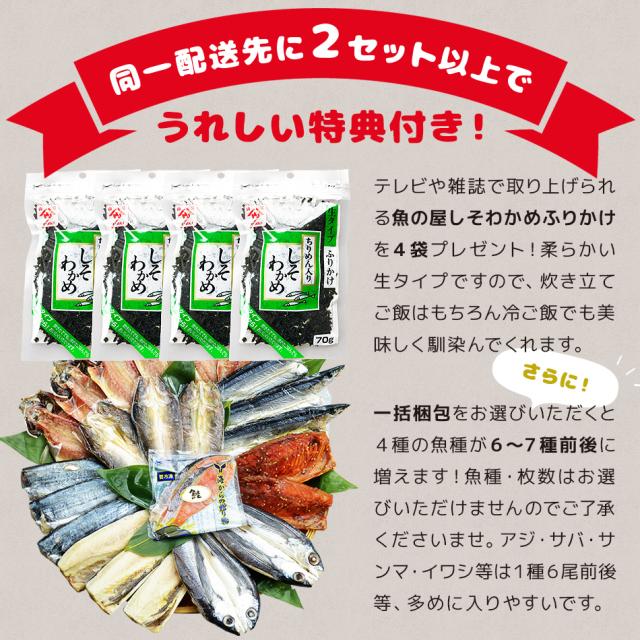 | 特筆事項 | 1配送先に2セット以上注文で、特典として魚の屋しそわかめふりかけプレゼント中。国産原料中心ですが、脂ノリや身の大きさを重視した結果、輸入原料を長崎加工したものも入ります。また、アジ塩干しとアジ味醂干し等、味付けが異なる同魚種はそれぞれ1種とカウントいたします。賞味期限が個別パッケージに表記されていない場合、外箱(ダンボール)の側面に一括表記ラベルを貼付しております。メーカーによりパッケージデザイン(商品の外観)や原材料の一部等は予告なく変更される場合があり、商品ページは旧情報で表示されている可能性がございます。予めご了承ください。 |