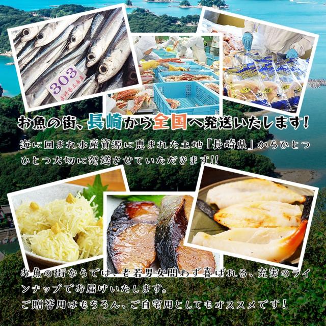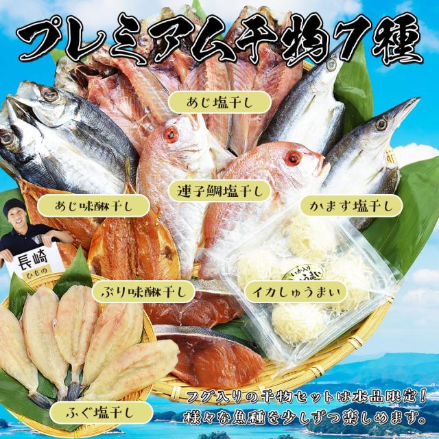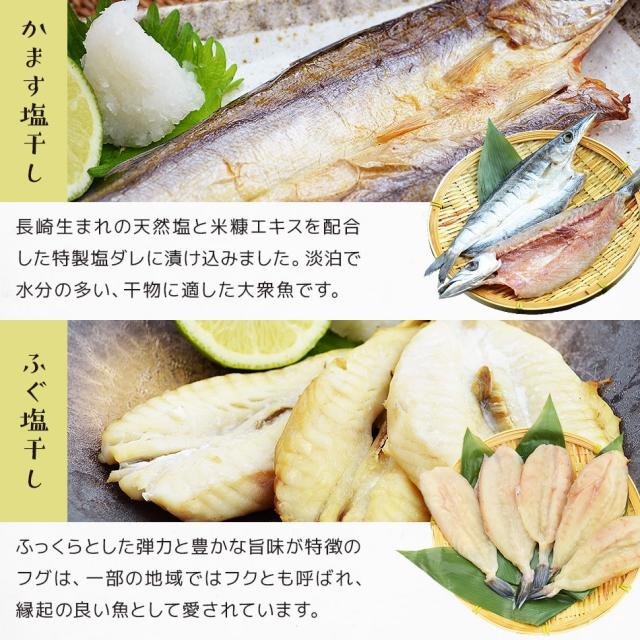 内容量:【長崎加工】連子鯛干物[一夜干し/九州産]2枚、あじ干物[一夜干し/九州産]4枚、かます干物[一夜干し/九州産]2枚、あじ干物[みりん干し/九州産]2枚、ぶり干物[みりん干し/九州産]2枚、いかしゅうまい5玉、ふぐ干物[一夜干し]170g