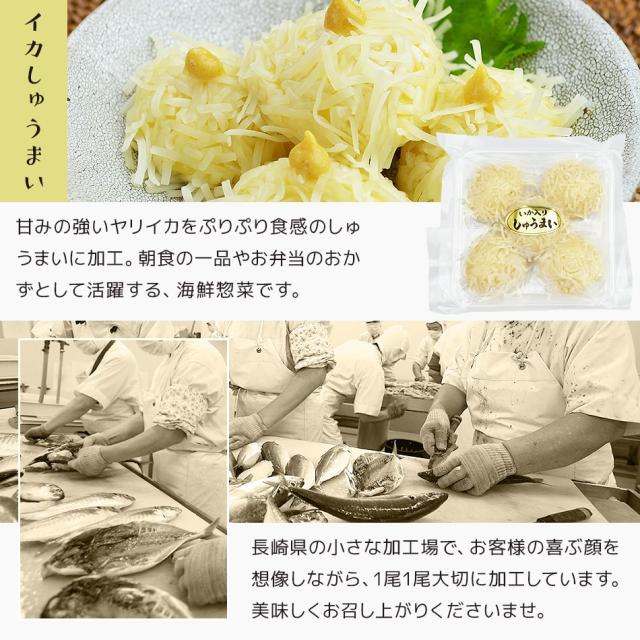 | 原材料 | [一夜干し]食塩、酸化防止剤(V.C)[みりん干し]塩、砂糖、醤油、みりん、ごま、調味料(アミノ酸等)、着色料(紅麹、アナトー)甘味料(ステビア)[イカしゅうまい]イカ(国産)、小麦粉、魚肉(タラ)、玉ねぎ、全卵、馬鈴薯澱粉、食塩、植物脂(菜種油)、乳化剤、酒精、トレハロース、調味料(アミノ酸) |