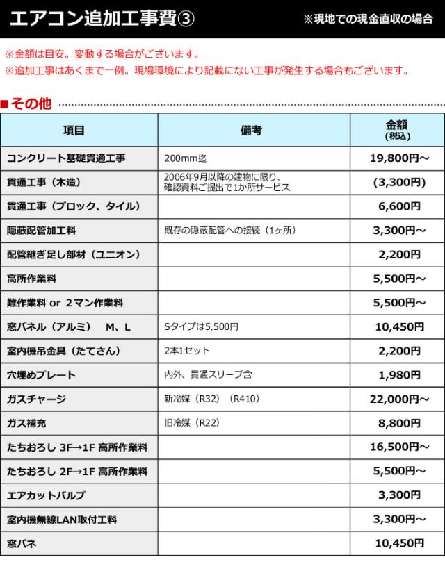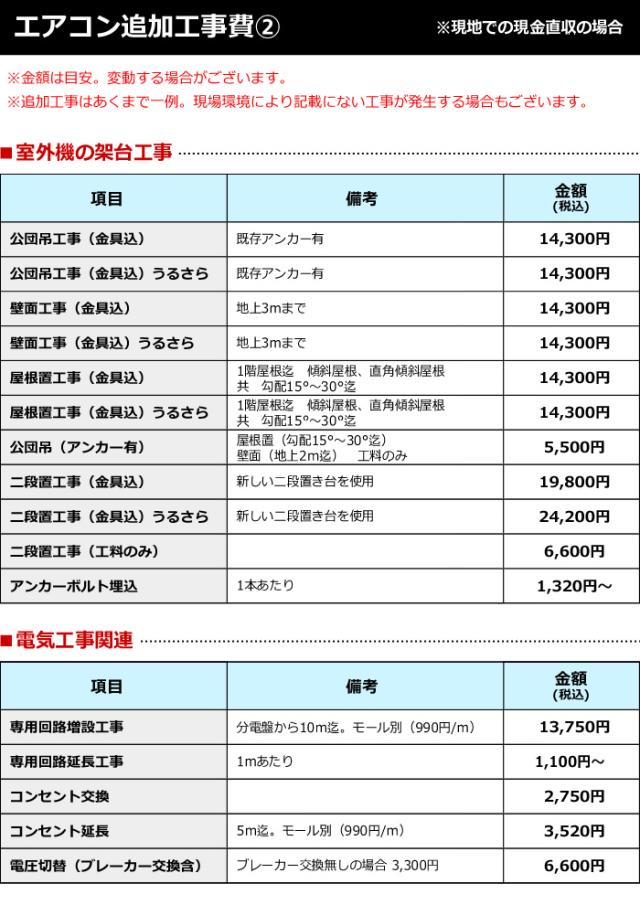 エアコン取付標準工事 ※単体でのお申込み不可。当店でエアコン本体をご注文の上、お申込みをお願い致します。 ※離島および一部の地域で、別途料金が発生する場合がございます。(地域によっては工事に伺えない場合もございます。) ※委託業者へ手配致します為、商品到着翌日以降の取付となります。 ※標準工事以外の追加工事(旧エアコンの取外・廃棄含む)が発生する場合には、その場で工事業者が集金させて頂きます。 ※ダイキン社製の「うるさら」シリーズ等、加湿/換気機能付きのエアコンは対応できません。別途掲載しております、加湿/換気エアコン用の標準工事をお申込みください。 標準工事費は、配管の穴・専用のコンセントがあり、配管パイプの長さが4メートル以内、室外機はベランダ、もしくは地面に置ける場所での工事費です。