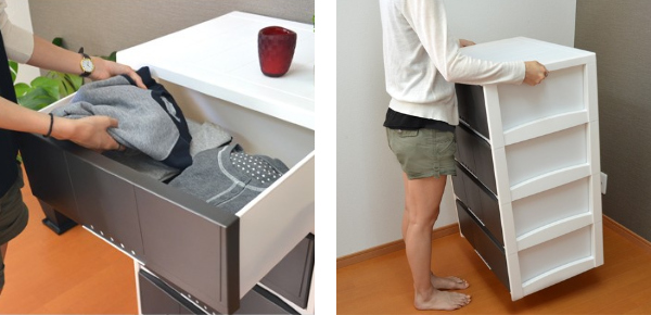| 中の物を出し入れしやすい めいっぱいに引き出しを引けるので、物の出し入れもスムーズ。奥の方に入れたものをすぐ見つけられます。 | 軽く、持ち運びしやすい 軽量設計で、女性一人でも持ち運びできます。 |