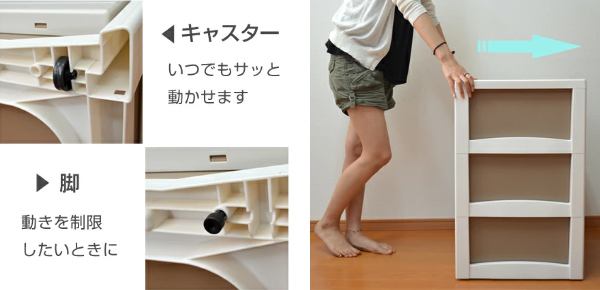 | キャスター・脚付き グッとはめ込むだけでセット完了です。必要に応じて使い分けることができます。 | 移動もラクラク キャスターを付ければ軽く押すだけで前後にスーッと移動可能です。お掃除の際にすぐ動かせるのでとても便利です(画像は3段)。 |